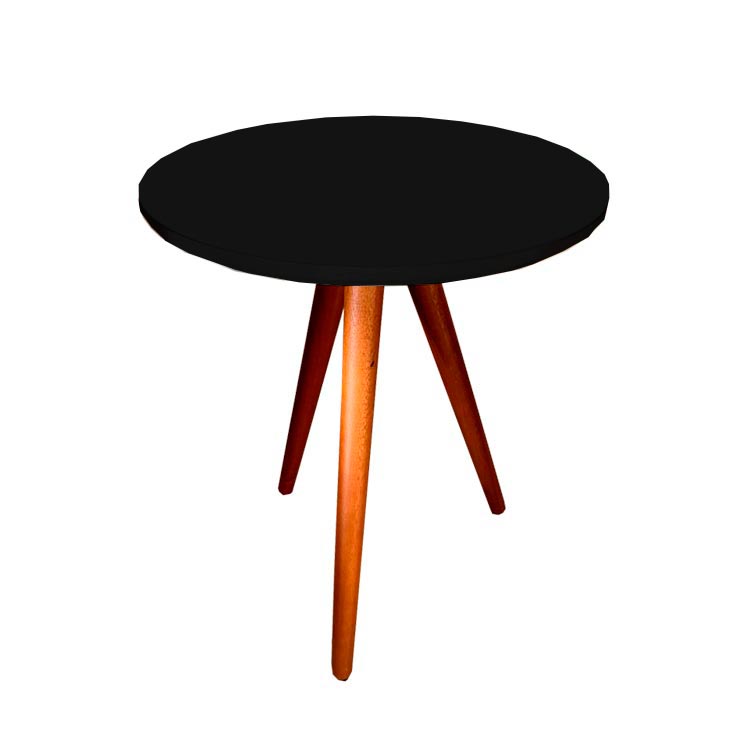 Mesa de apóio com pés palitos amadeirados e tampo preto.